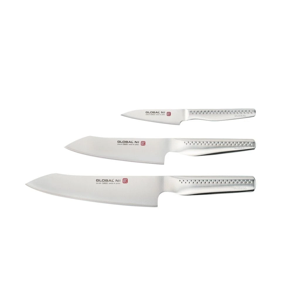 This 3 piece set contains a good starting set for any Global Ni fan. With a large, medium and small knife which will cover the vast majority of any work you need to do in the kitchen.