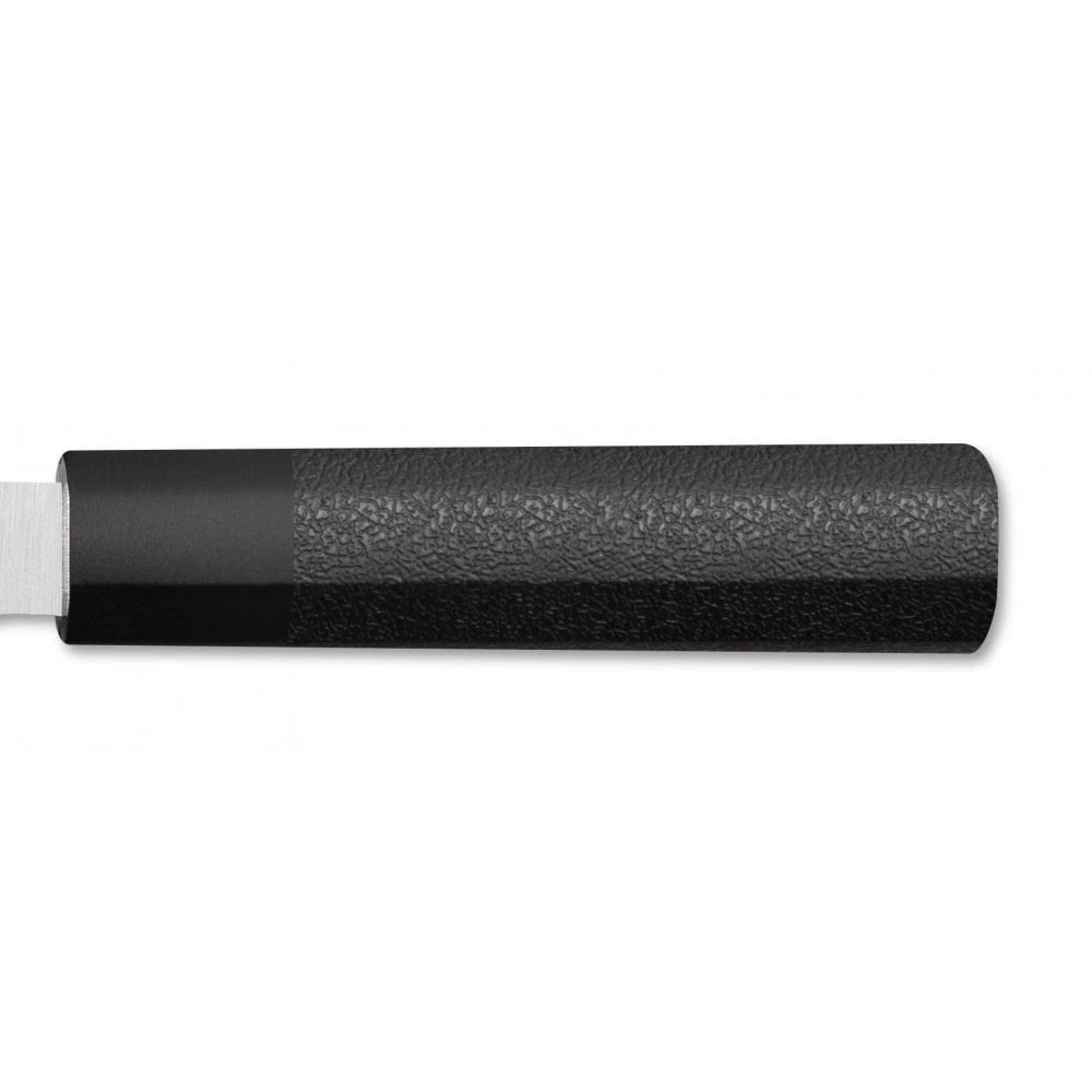Unique technologies are applied in producing the blade of the Seki Magoroku Kinju and Hekiju knife series, making it possible to create the demanding, pointed cutting edges of traditional Japanese kitchen knives. They are ground on one side, which guarantees an optimal and straight cut. Maximum blade sharpness is achieved by the highly precise processing of the cutting edge. The handles of the Seki Magoroku Kinju and Hekiju series differ in shape and material. The hexagonal handle of Kinju knives is made of laminated, reinforced wood for a comfortable feel when cutting. The handle is extremely water-resistant, thanks to the use of high-quality natural wood which is treated by a special process. The handle of the Hekiju knife, developed for left-handers, is more rounded than that of the Kinju series and consists of a robust resin with leather-type embossing.