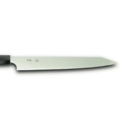 After graduating from the Department of Electrical Engineering in Takefu Technical High School in 1967, Masanobu started working in the knife industry with his father, Monjiro II . Originally a blacksmith of gardening tools, Masanobu Okada specialises in making unique kitchen knives. Here we present a knife that he makes for fun, the Takobiki knife, which is a variation of the Japanese sashimi knife used to prepare Sashimi.