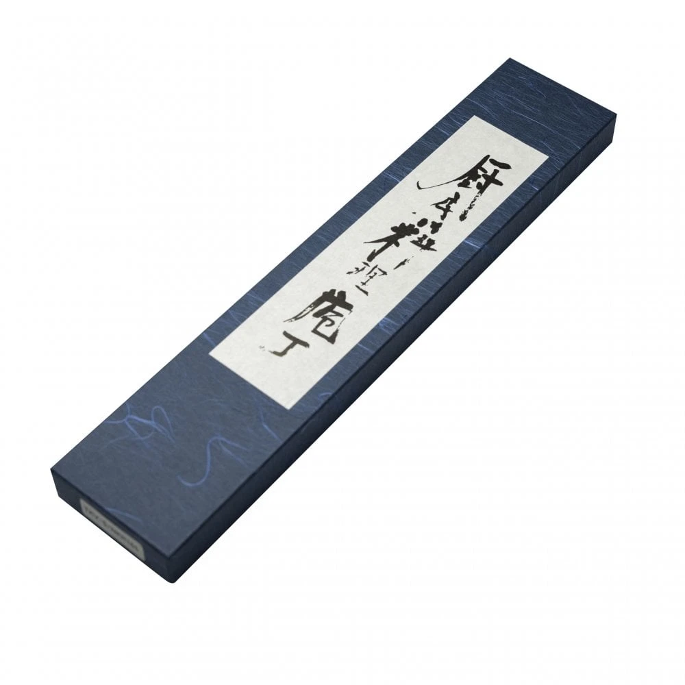 Shiro Kamo knives are produced in Takefu Knife Village by Hand and are some of the finest knives coming out from the collective. Kamo works with a variety of materials; These knives have a powdered steel SG-2 core with a very high hardness rating, SG-2 being one of the most advanced stainless steels available in knife manufacturing. The core steel is sandwhiched between layers of stainelss steel with a damascus pattern. The knife features a deep reddish brown handle made from Sandalwood. These knives are good value for those wanting a knife made from powdered steel.